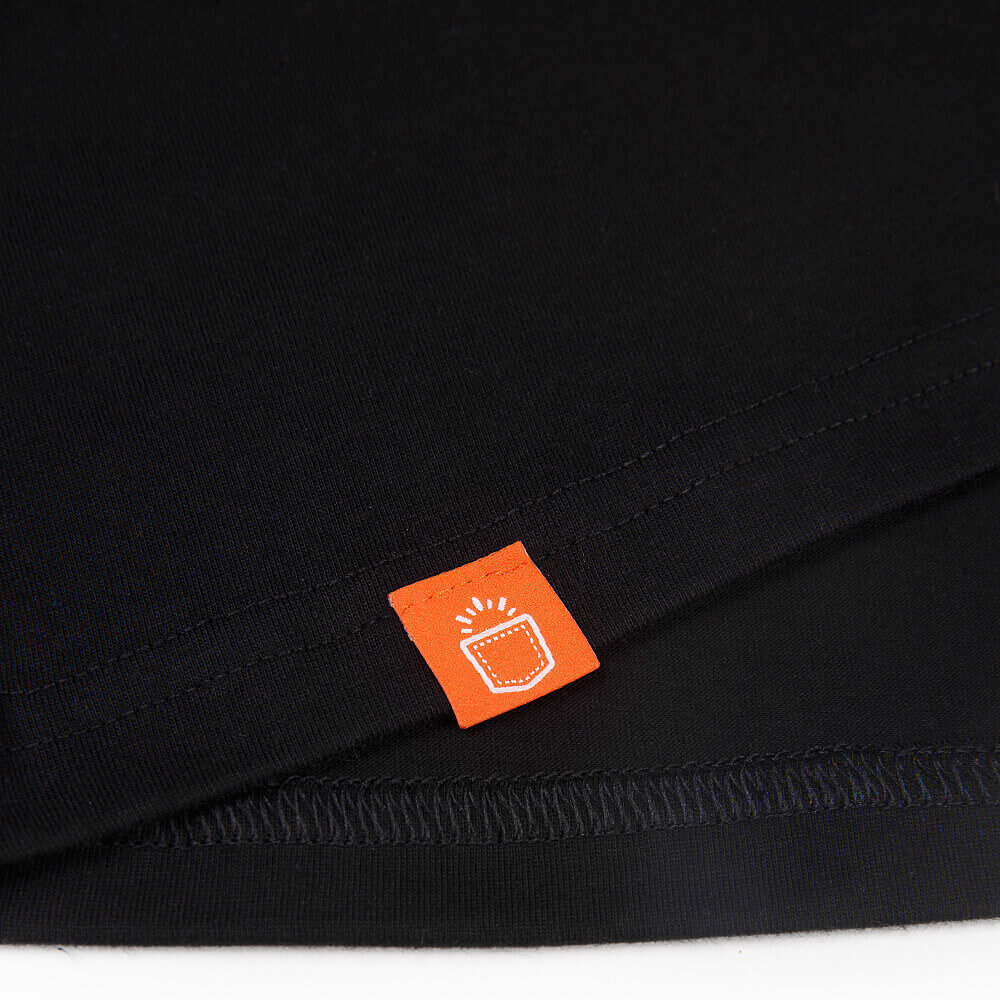Czarna, wyprodukowana w Polsce koszulka męska o klasycznym kroju uszyta z wysokogatunkowej, stuprocentowej bawełny. Lekko dopasowana i miękka w dotyku z unikalnym wzorem. Jej jakość przejawia się również w dbaniu o detale: wewnętrzna taśma na karku (potnik) z subtelnym nadrukiem kieszonkowego słońca oraz zewnętrzna metka z jego symbolem.