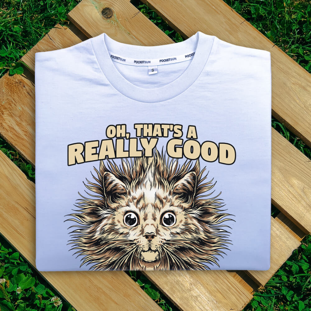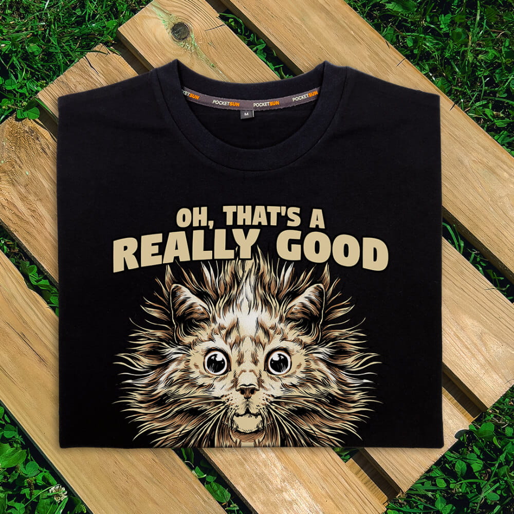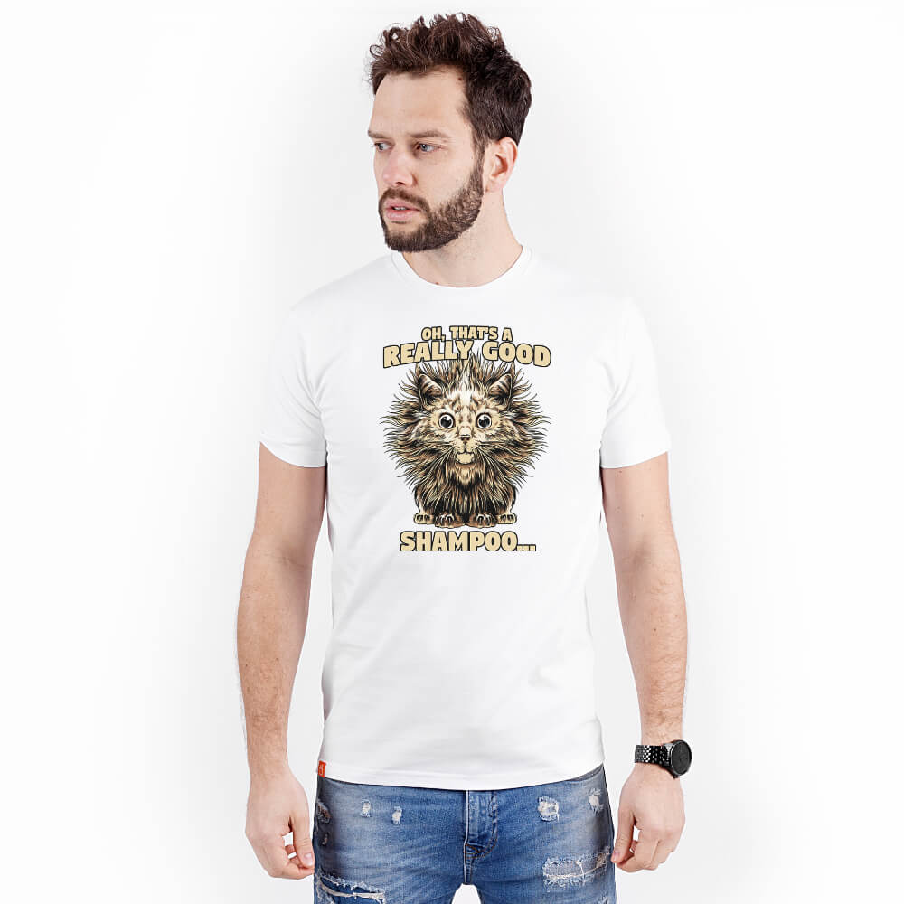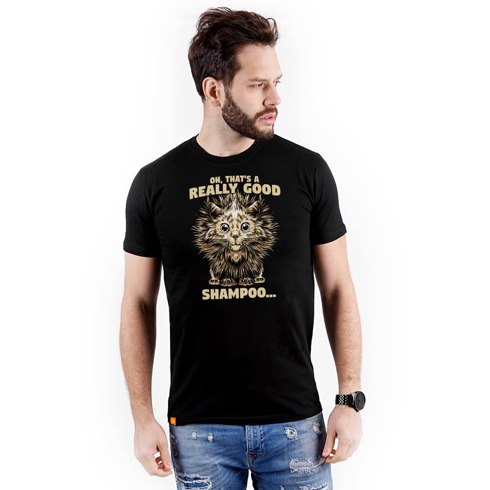Czarna lub biała, wyprodukowana w Polsce, koszulka męska z wysokogatunkowej, stuprocentowej bawełny. Lekko dopasowana i miękka w dotyku z unikalnym wzorem o kociej tematyce. Jej jakość przejawia się również w dbaniu o detale: wewnętrzna taśma na karku (potnik) z subtelnym nadrukiem kieszonkowego słońca oraz zewnętrzna metka z jego symbolem.