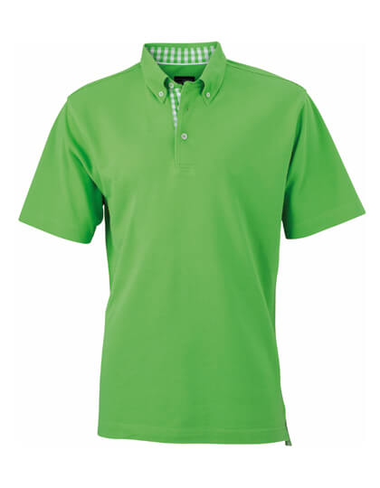 Koszulka polo ze wstawkami w kratkę | Tkanina czesana piqué | Kołnierz typu button-down | Taśma na karku oraz wew. strona listwy guzikowej, wykończone ozdobną kratką | 3 guziki | Półokrągły karczek | Bawełna czesana typu ring-spun
