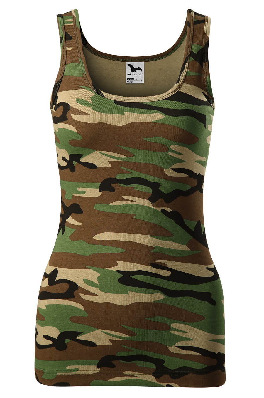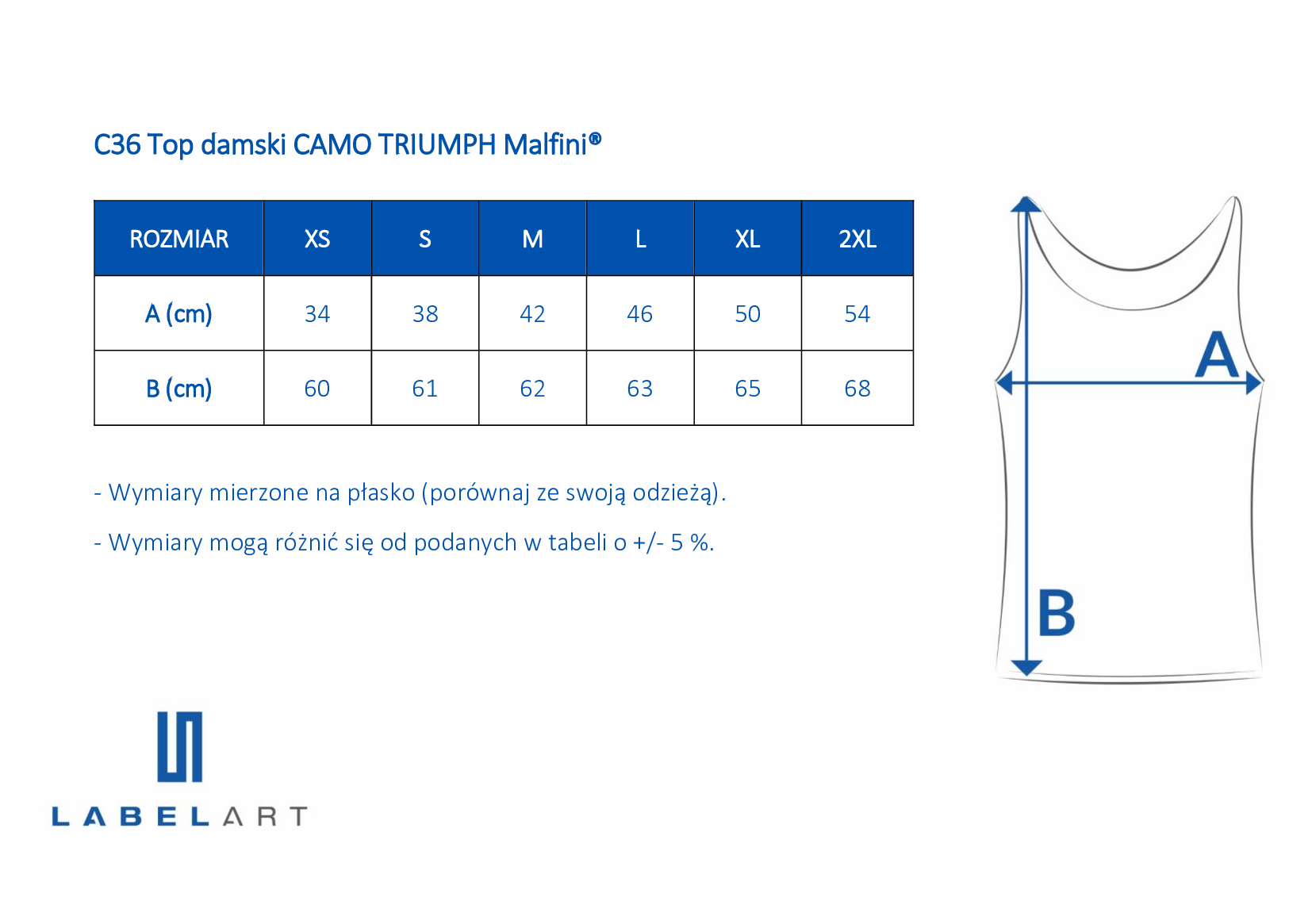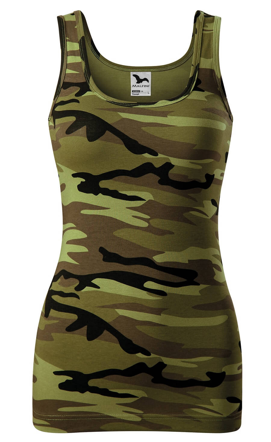 Modny top o dopasowanym kroju slim - fit dostępny w różnych wersjach kolorystycznych kamuflażu. Uszyty z dzianiny single jersey, z bawełny z dodatkiem elastanu. Koszulka posiada duży, okrągły dekolt z lamówką z materiału wierzchniego. W ten sam sposób wykończone zostały otwory na ramiona. Top ma lekko poszerzone ramiączka. Fason tej elastycznej koszulki został wzmocniony szwami bocznymi. Model Camo Triumph świetnie sprawdzi się w codziennym użytkowaniu, w tym również podczas aktywności fizycznej, jako samodzielna odzież lub do wykorzystania pod bluzę. W kolekcji Malfini® znajdziemy również model Triumph w jednolitych kolorach.