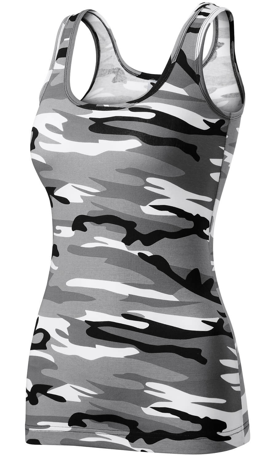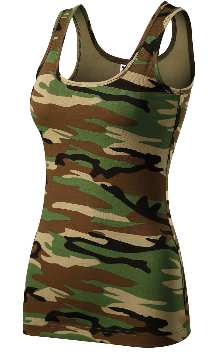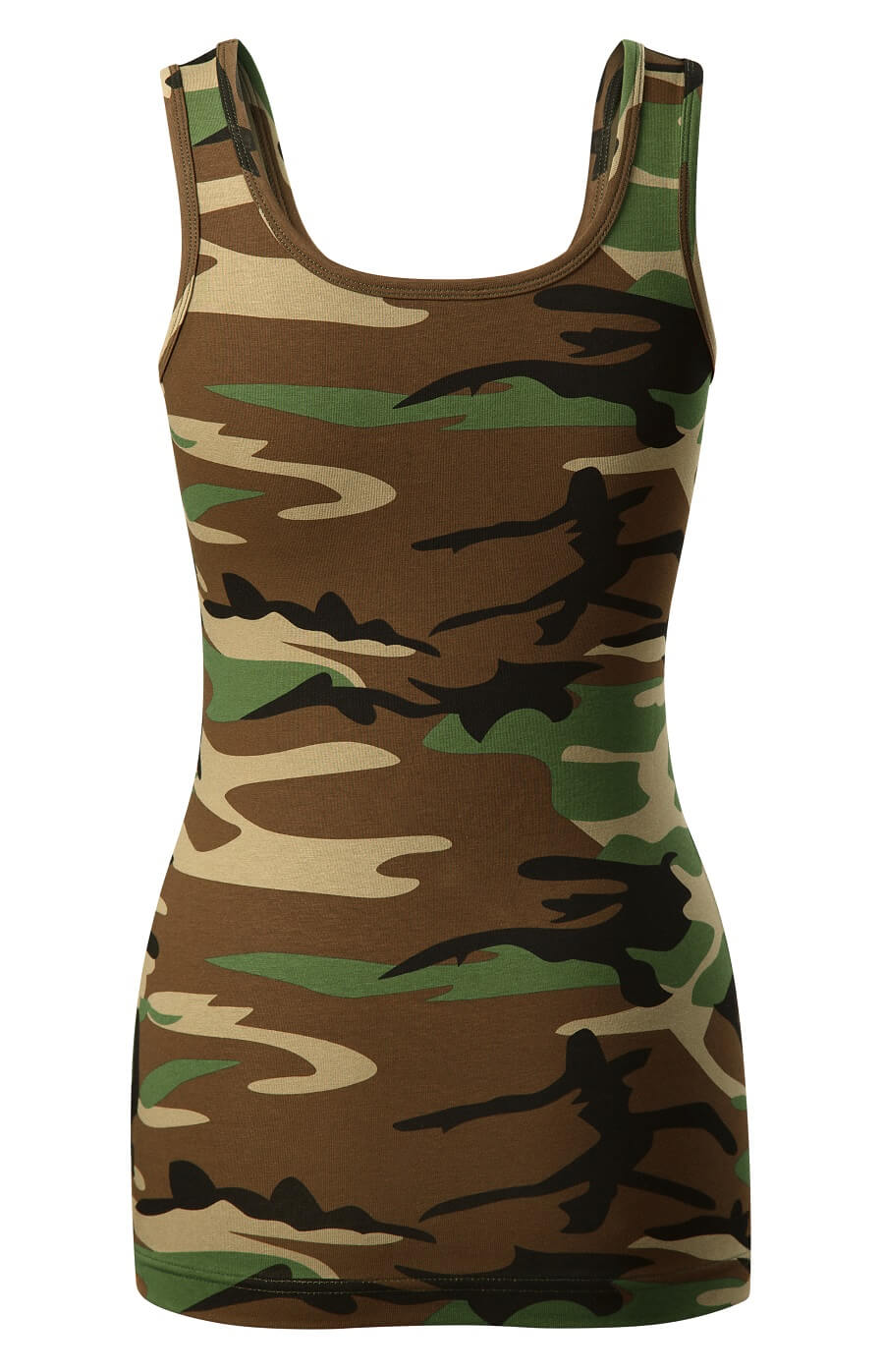 Modny top o dopasowanym kroju slim - fit dostępny w różnych wersjach kolorystycznych kamuflażu. Uszyty z dzianiny single jersey, z bawełny z dodatkiem elastanu. Koszulka posiada duży, okrągły dekolt z lamówką z materiału wierzchniego. W ten sam sposób wykończone zostały otwory na ramiona. Top ma lekko poszerzone ramiączka. Fason tej elastycznej koszulki został wzmocniony szwami bocznymi. Model Camo Triumph świetnie sprawdzi się w codziennym użytkowaniu, w tym również podczas aktywności fizycznej, jako samodzielna odzież lub do wykorzystania pod bluzę. W kolekcji Malfini® znajdziemy również model Triumph w jednolitych kolorach.